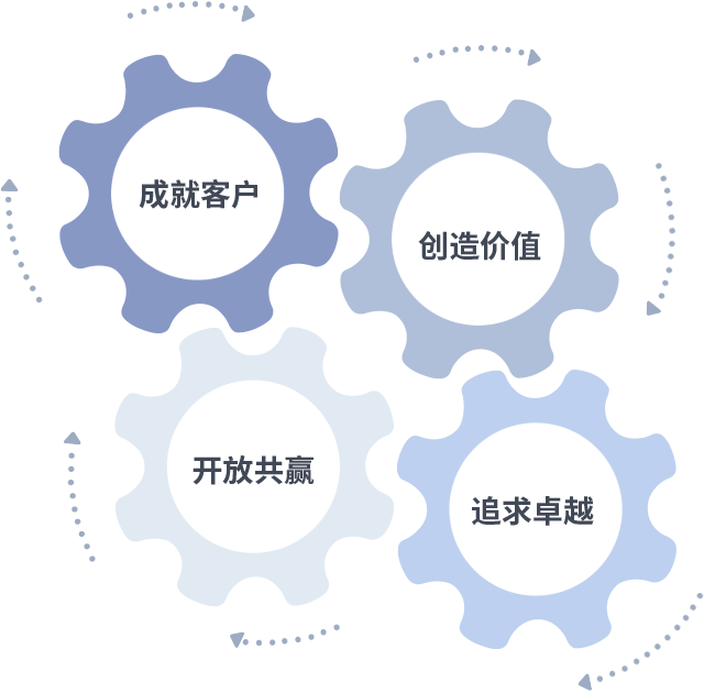 成就客户是一切决策的出发点,,,,创造价值是衡量所有工作的标准,,,,追求卓越是我们做事做人的态度,,,开放共赢是我们的格局也是最终的结果。。价值观的齿轮环环相扣,,推动着组织里的每个人不断向前。。。。